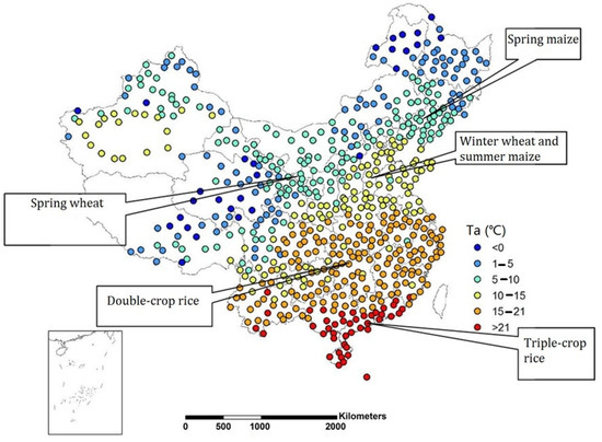 Spatial distribution of mean annual temperature and main grain crop patterns in China (Ta—mean annual temperature based on the data from 1 January 1971 to 31 December 2000).