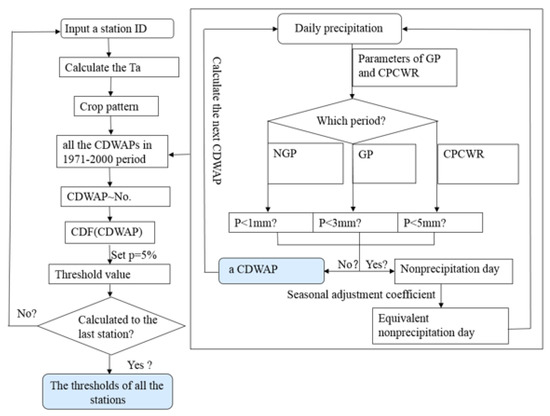 EADs threshold model calculation flowchart. (P—daily precipitation; Ta—mean annual temperature; CDWAP—consecutive days without available precipitation; No.—number of occurrences; CDF—cumulative probability distribution function; p—percentile; GP—growing period; NGP—non-growing period; CPCWR—critical period of crop water requirement).