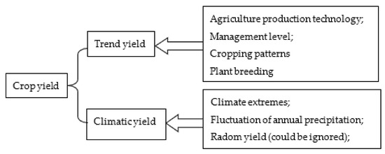Grain yields were divided into trend yield and climatic yield in this study (Figure 5). The trend yield is mainly related to the improvement in the technologies (mechanization and fertilization) and management level of agricultural production and the improvement in cropping patterns and variety cultivation, which was a stable increased yield [63]. Furthermore, global warming and the greenhouse effect were also attributed to a fraction of the stable increasing trend. The climatic yield covered the impacts of climatic elements with interannual fluctuations and climate extremes on grain yield and the random yield. In this study, the trend yield was removed by using linear trend fitting and then the response of climatic yield to EADs was analyzed. Given that EADs were likely to occur in the years with low annual precipitation, the climatic yield induced by extreme drought events included a part of the climatic yield caused by interannual fluctuations of precipitation.