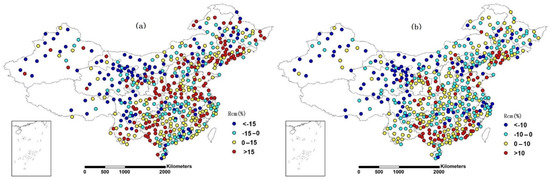 The EAD series (the series exceeding EAD thresholds) were divided into two periods (1961–1984 as the reference period and 1985–2007 as the research period) to analyze the change rates of the frequency and intensity of EADs during 1985–2007 relative to those during 1961–1984 (i.e., the ratio of the differences in annual change rates between the two periods to the annual change rates of the former period), as shown in Figure 7a (frequency) and Figure 7b (intensity). Positive relative change rates in both frequency and intensity implied EADs occurred more with stronger intensity in the research period, and vice versa.