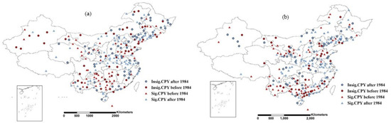 The first change-point of EAD frequency and intensity series of individual stations were detected using the moving t-test method. Meanwhile, its significance and trend were determined. A positive t value represented a change-point with a downward trend, and vice versa. Since areas with increasing EADs tend to suffer potential threat of drought disaster and thus receive more attention, they were mainly analyzed in this section. Only stations with increasing frequency and intensity of EADs were marked in Figure 8a (frequency) and Figure 8b (intensity).
