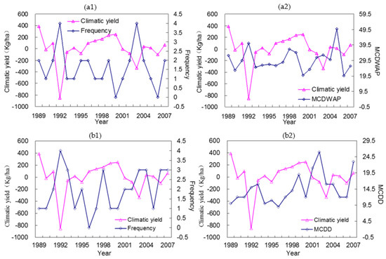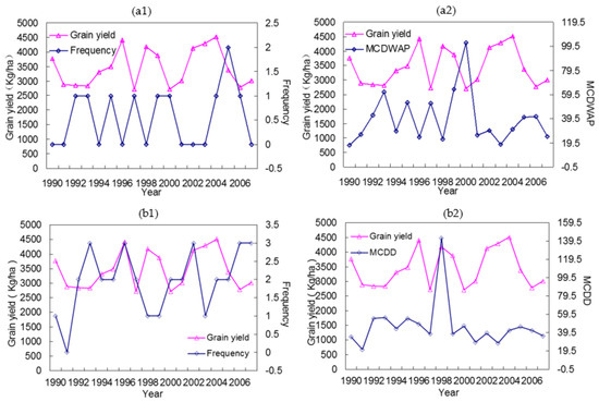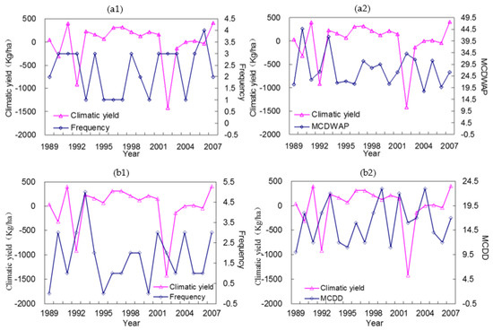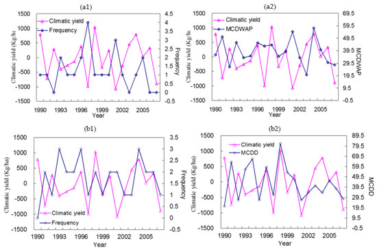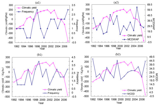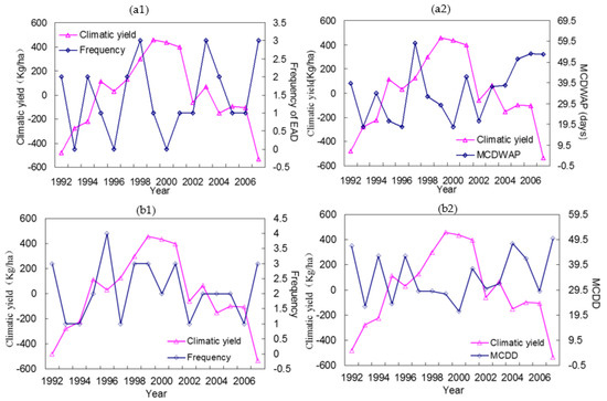 The grain yield in Bijie City significantly increased over the years, and thus the response of the climatic yield to EADs was analyzed after removing the trend yield from the grain yields. As shown in Figure 11(a1,a2), there was also a negative correlation between the climatic yield and EADs. The climatic yield reached the minimum and the secondary minimum in 1992 and 2003, when EADs occurred four times (the highest frequency during the period) and the MCDWAP was also high. In 2005, although the MCDWAP was long, only one EAD occurred in Bijie City. As a result, the grain yield in 2005 was not significantly decreased under the impacts of droughts. On the other hand, the climatic grain yield reached a relatively high value in 2000, when no EAD occurred and the MCDWAP was very short. According to the response of climatic yield to EDs, there was also a negative correlation between the climatic yield and EDs (Figure 11(b1,b2)). However, the response of the climatic yield to EDs was poorer than the response of climatic yield to EADs in Bijie City.