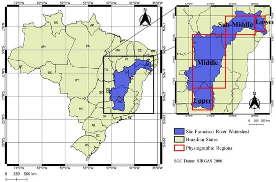 The SFRB (Figure 1, left) covers an area of approximately 638,466 km2, comprises about 7.5% of the entire Brazilian territory, and has a population of over 14 million inhabitants [18,69]. Most of the population (7,075,587 people) is located in the Upper SF [69]. Along its physiographic regions, fragments of different biomes are found, such as: Cerrado in the Upper and Middle SF; Caatinga in the Middle, Sub-Middle, and Lower SF region; and the Atlantic Forest in the Upper region and in the coastal areas of the Lower SF [19,70].