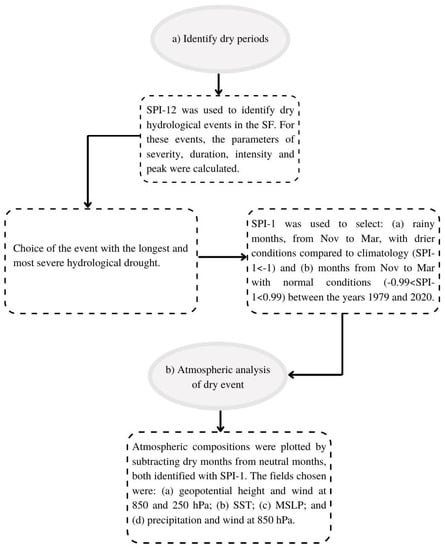 While there are several studies that identify the droughts over the region of the São Francisco River Basin (SFRB), concentrating on evaluating extreme drought events in terms of occurrence, persistence, spatial extent, severity and impacts, e.g., Paredes-Trejo et al. [24], few discuss the drivers of the droughts. Therefore, making use of the SPI, this study aims to: (a) identify hydrological drought events in each one of the four subregions of the SFRB from 1979 to 2020 through a SPI–12 time series and (b) analyze the anomalous atmospheric and oceanic patterns associated with the anomalous dry rainy season months (identified via SPI-1) registered during the hydrological drought, with the longest and most severe drought identified in (a), taking into account the events identified for all the regions.