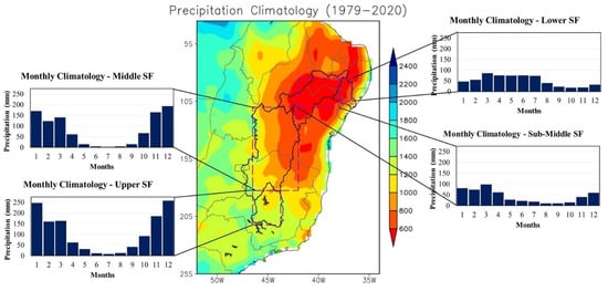 The annual and monthly rainfall climatology in the SFRB, considering the period from 1979 to 2020, were calculated in order to identify the wet season in the subregions. The results are shown in Figure 3.