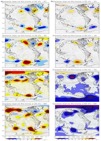 The geopotential height composite map and wind at 850 and 250 hPa shows a wave propagation pattern from the vicinity of Australia through Southern South America to the SEB region of Brazil (Figure 4a,b) through all months (Dec–Mar). In the SEB, this pattern reaches positive values of geopotential height and anticyclonic atmospheric circulation, which characterizes a region with a high atmospheric pressure system. This circulation pattern, shown in Figure 4, is similar to the anomalous patterns found for the drought associated with the Brazilian energy crisis in 2001 [91] and the water crisis in the SEB in 2014 [54].