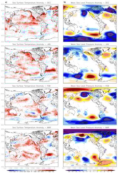Column (a) SST anomaly and (b) MSLP anomaly—considering the subtraction of the dry months within the hydrological drought event from the normal months, both identified with the help of SPI-1 for the Upper SF. This field was plotted for the months from Dec to Mar.