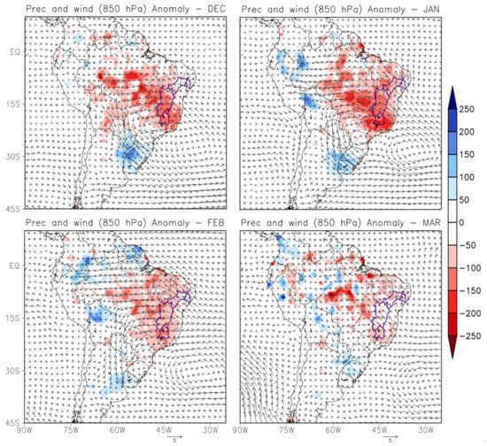The composite map of precipitation anomaly for each month from Dec to Mar within the period 2012–2020 shows a deficit of precipitation in several regions of the country (Figure 6). The SEB and NEB regions were the most affected, with rainfall deficits reaching 250 mm in Jan. The SEB faced a serious water crisis between 2014 and 2016, as studied by Coelho et al. [25], Finke et al. [26] and Marengo et al. [53]. Regarding the low-level wind anomaly, there was an anomalous anticyclonic circulation on or near the south and SEB coast. In March, when this system was further away from the coast, the dry conditions were milder. Confirming the result already found through the SPI-12 analysis, the precipitation anomaly composite map shows the Upper SF region as the most affected by the deficit of precipitation. The largest negative rainfall anomalies are associated with the presence of a positive MSLP anomaly near the coast of SEB Brazil (Figure 5b). This anomalous high pressure seemed to enhance the flow of the low-level jet east of the Andes towards Southeastern South America (Figure 6), then favored shaping a precipitation dipole between the south and SEB. In this dipole, the lack of rain in the region of the SACZ is associated with above-average precipitation in the southern region of the country or vice-versa [41,45,92,93]. These anomalous precipitation and low-level circulation patterns were also similar to the ones registered in the energy crisis in 2001 [91].