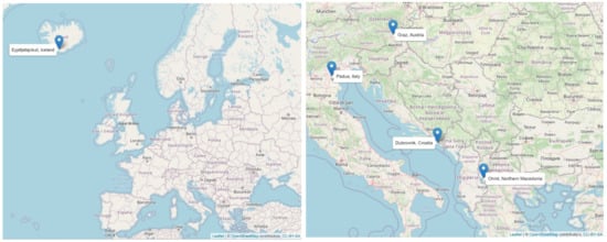 Positions of Eyjafjallajökull volcano (left), and the IGS reference stations in the Adriatic Sea region that provided GPS observations for the research presented (right); illustrations were arranged using Open Street Map spatial data, and a bespoke software development in the R environment was used for statistical learning.