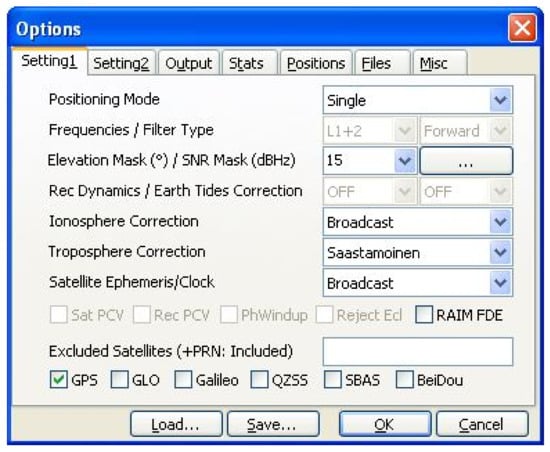 The downloaded data from IGS stations were input into the RTKLIB software in order to simulate the behaviour of a single-frequency GPS receiver using real GPS pseudorange observations [29]. The software-defined RTKLIB GNSS receiver (rev 2.4.3 b34) was set to apply GPS-only, single-frequency position estimation with an elevation mask at 15º and broadcasted satellite ephemeris data. The broadcast model (i.e., Klobuchar) was applied for ionosphere correction and broadcast data and the utilisation of broadcast ionospheric (Klobuchar) and Saastamoinen model for tropospheric correction, as depicted in Figure 2. This may be considered a common practice for an ordinary, single-frequency GPS receiver [32,33].