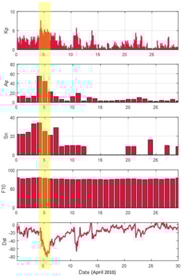 Figure 3 presents the global indices (Ap, Kp, F10, Sn and Dst) for the month of April 2010. A short-time geomagnetic disturbance occurred around Day 105 (5 April 2010), as highlighted in Figure 3. Other than this, it is observed that the space weather situation was mostly calm in the period covered by this research. This allowed for the presumption that any potential positioning accuracy deterioration or VTEC enhancements, occurring other than Day 105, are solely by the Eyjafjallajökull volcanic ash.