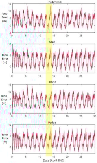 Vertical TEC (VTEC) observation time series are derived from dual-frequency GPS observations, as outlined in Section 3.2. and depicted in Figure 4, using the equivalence between VTEC and the ionospheric time delay dIONO (1) and (2). A comparison was made between the days of considerable TEC disturbance and quiet TEC conditions for the reference sites in observation, as depicted in Figure 5. Figure 6 depicts the ionosphere delay error for all stations in metres. We infer that the enhancements observed on Day 105 were due to the mild geomagnetic disturbances (as depicted in Figure 3). However, it may be observed from Figure 4 that the increase in error variation is also observed on Day 114 (highlighted in the figure) when there is no geomagnetic disturbance. These increased levels of the vertical ionospheric delays are particularly evident at the reference stations significantly affected by the Eyjafjallajökull volcanic ash: Graz, Austria, with approx 15% increase in the maximum value; and Padova, Italy, with approximately a 16% increase in the maximum value, respectively, compared with the undisturbed levels. We infer that the increased vertical ionospheric delay in latter period may have resulted from the Eyjafjallajökull volcanic ash effects.