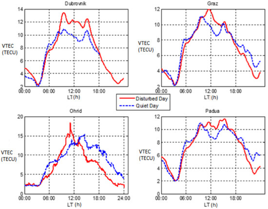 To further investigate the increase in VTEC on Day 114, we compared the diurnal TEC of Day 114 (indicated as Disturbed Day on Figure 5) with the quietest day in the month of April 2010 (indicated as Quiet Day on Figure 5). The quiet day was chosen as the day with Kp ≤ 2. A significant increase in VTEC, especially for Dubrovnik and Ohrid stations, was observed, and thus further confirmed that an unexpected VTEC enhancement was obtained on Day 114 when the geomagnetic activity was undisturbed.