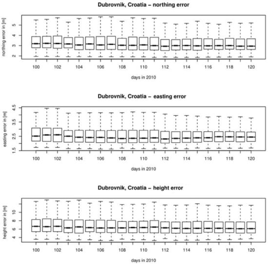 Box-and-whisker plot of GPS positioning errors as observed at Dubrovnik, Croatia reference station during days 100–120 in 2010.