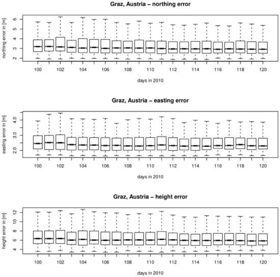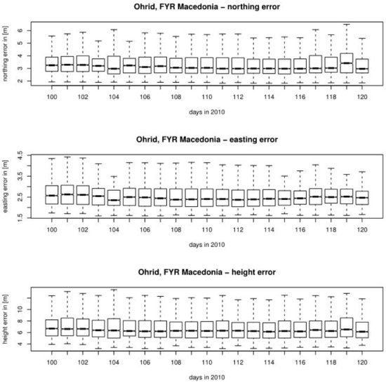 Box-and-whisker plot of GPS positioning errors as observed at Graz, Austria reference station during days 100–120 in 2010.