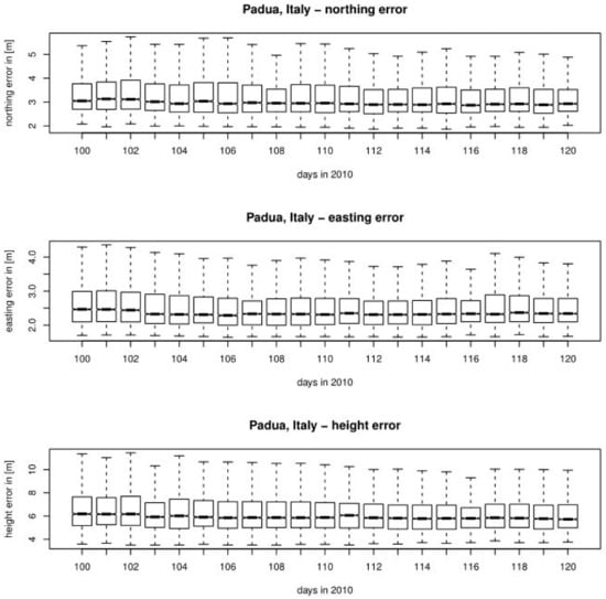 Box-and-whisker plot of GPS positioning errors as observed at Padua, Italy reference station during days 100–120 in 2010.