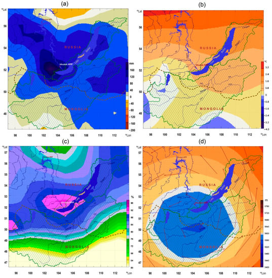 Examples of real-time analysis of actual climatic indicators in Lake Baikal (shaded lines show catchment areas of the Selenga River and part of Lake Baikal): (a) precipitation anomalies for months 8–9 of 2020; (b) surface temperatures for months 8–9 of 2020; (c) average monthly relative humidity in September 2020; (d) visualization of an anomalous cyclone at an isobaric surface height of 500 hPa for the period of 12–15 September 2020.