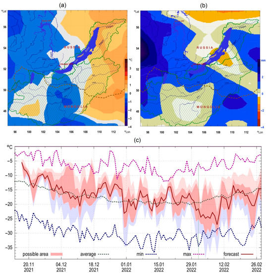 Examples of prognostic indicators creation for the winter period 2021–2022 (shaded lines show catchment areas of the Selenga River and part of Lake Baikal): (a) distribution of deviations from the average surface temperatures in February 2022; (b) the likely anomalies of precipitation intensities in February 2022; (c) the dynamics of changes in the temperature conditions in comparison with the actual average, minimum, and maximum average daily indicators for the area of Kyakhta (50.37° N, 106.40° E).