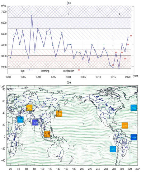 Based on the analysis of global climatic indicators [25,26], we have identified the relationships between the variability of atmospheric circulation in the basin and the total inflow into it. These relationships are used to form potential predictors and adjust multivariate neural networks according to the prognostic interval estimates of inflow.
