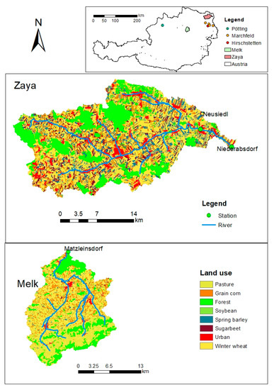 The Melk catchment (282 km2) and the Zaya catchment (522 km2), both of which are located in lower Austria (Figure 1), are two agricultural catchments with typical annual crops for the region. The percentages of cropland and pasture area in the Melk catchment are 63% and 12%, respectively, and in the Zaya catchment are 69% and 8%, respectively. The remaining areas in these two catchments are forest and urban. The main field crops grown in the Melk catchment are winter wheat, grain corn, soybean, and spring barley, while the main crops grown in the Zaya catchment are winter wheat, spring barley, sugar beet, and grain corn (INSPIRE data available from www.inspire.gv.at). Table 1 shows the site characteristics of both catchments.