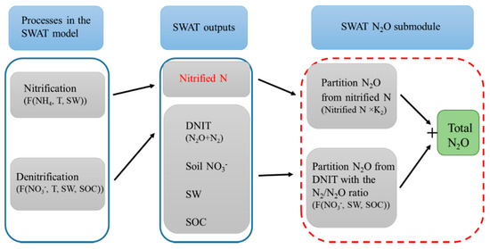Schematic diagram of the processes included in the SWAT model and the SWAT N2O submodule. Nitrified N in a red color indicates the SWAT model simulates the nitrified N but can only be examined in the output file after the SWAT source codes were modified. Abbreviations: F: function. T: soil temperature. SW: soil water. SOC: soil organic carbon. DNIT: denitrification. K2: the fraction of nitrified N lost as N2O.