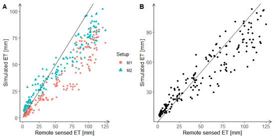 Scatter plot for simulated and remote sensed monthly ET for the years 2001–2015 in the Melk catchment (A) and Zaya catchment (B). The black line is the reference line with slope 1.