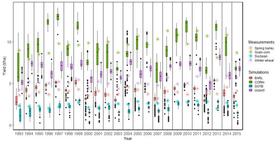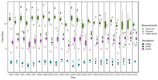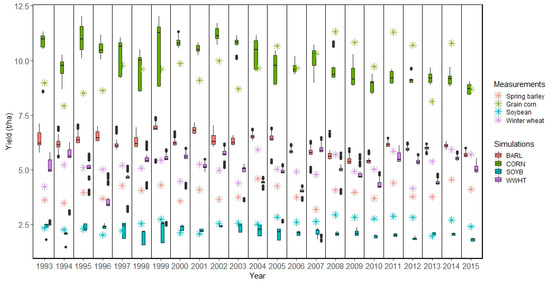 The main crop yields from SWAT were compared to available measured data at the district level. Figure 4, Figure 5 and Figure 6 show simulated crop yields in the Melk and Zaya catchments at the HRU level compared to reported yields for the years 1993–2015. For the Melk M1 setup, the spring barley yields were consistently and grossly overestimated (Figure 4). The BARL category in SWAT included several other crops that cover a wide range of yields (Table S2), for example, in addition to spring grains, the BARL category included flax, buckwheat, and quinoa. Although the SWAT simulated yields for CORN, SOYB, and WWHT varied across the HRUs, the median of simulated crop yields from all HRUs fit the measured crops yields rather well (Figure 4 and Figure 5).
