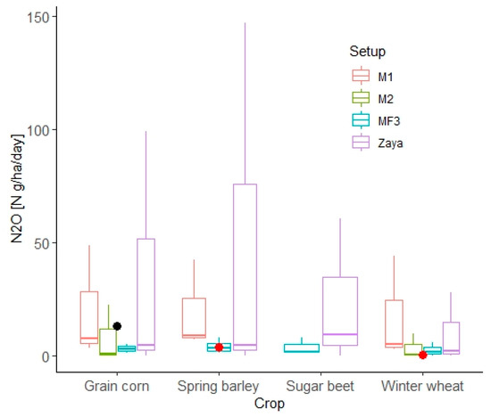 Similarly, measured N2O data from an outdoor lysimeter experiment in Hirschstetten, Vienna, located about 46 km away from the Zaya outlet gauge (Figure 1), was compared to the simulated N2O emissions from crops in the Zaya catchment. Hirschstetten has a dry climate similar to the Zaya catchment (Table 3). The measured N2O data from spring barley and winter wheat in Hirschstetten were collected in 2018 and 2019, respectively.