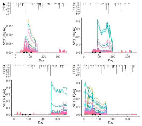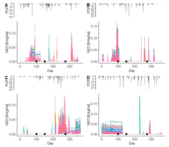 The measured hourly N2O emissions in Pötting and Hirschstetten were both aggregated to the daily time step, respectively, to compare with the corresponding simulated daily N2O emissions from the submodule. Linear interpolation was used to generate the cumulative N2O flux during the crop growing season [46,47,48]. In the Zaya catchment for each of the years 2006 to 2015, a one-way analysis of variance (ANOVA) was performed in R to analyze the effect of daily precipitation on daily N2O emissions during the growing season of spring barley (from approximately 22 March to 1 August each year).