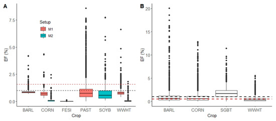 Wet climates are defined to occur in temperate and boreal zones, where the ratio of annual precipitation to potential evapotranspiration is >1, and in tropical zones, where total annual precipitation is >1000 mm [5]. In wet climates, the N2O EF value is 0.6% of the organic N inputs (uncertainty range of 0.1–1.1%) and is 1.6% of the mineral N inputs (uncertainty range of 1.3–1.9%) [5]. In dry climates, the N2O EF value is 0.5% of the total organic and mineral N inputs (uncertainty range of 0–1.1%) [5].