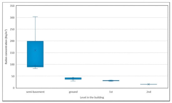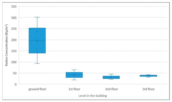 Radon measurements indicate high values for indoor radon concentration at the lowest levels of buildings, indicating its seepage from the soil and accumulation in the basement or rooms where floors are in contact with the ground. The decrease in concentration towards the upper part of the building indicates that the contribution from building materials is negligible, the main radon source being geogenic. Besides building materials, the stack effect also has a low impact in terms of increasing the radon level (coming from the soil) at floors higher than basement/ground floor [,].