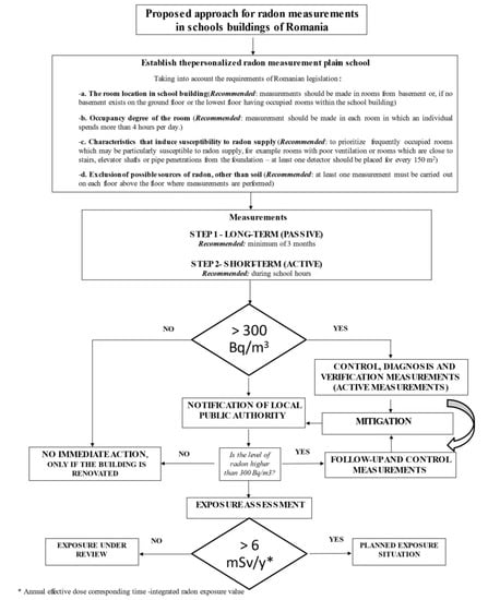 In order for accurate, consistent, and relevant radon measurements to be ensured in Romanian schools, radon measurements need to be based on a standardized protocol. On the basis of international and national references and the results of radon studies, we proposed an approach for radon measurement in Romanian schools. The proposed approach for radon measurements in schools is presented, in the form of a flow chart, in Figure 3, taking into account the decision-making procedure and prioritization of actions on the necessary level of regulatory control in Romania according to Council Directive 2013/59/Euratom [,,,].