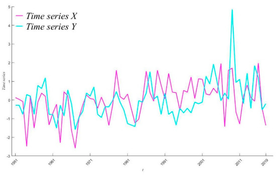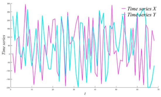 To study the graph of Equation (9), as in Ref. [23], two time series X and Y with sample sizes of 68 are first generated at random. Their trend coefficients are −0.024 and 0.027, respectively, which are obviously very small. The time series X and Y are illustrated in Figure 1.