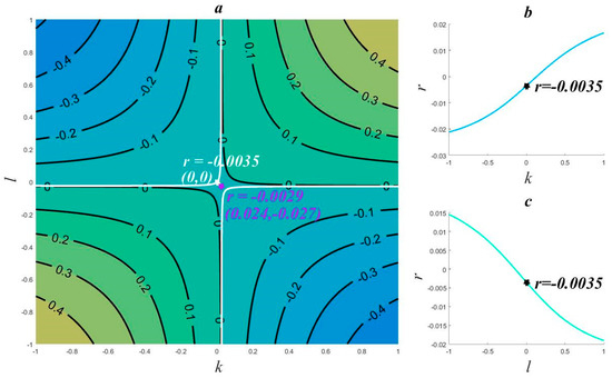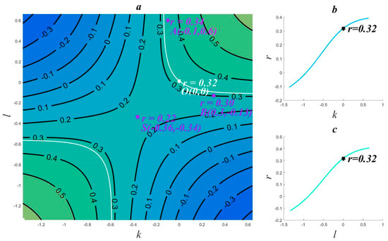 In statistical terms, there is no variation in the trends for time series X and Y, and we can consider the trend coefficients to be zero and their correlation coefficient to be −0.0035. In Ref. [23], a large number of simulations are used to superimpose the trend changes on time series X and Y in order to determine the correlation coefficient with respect to k and l (see Figure 1 in Ref. [23]). However, we can plot the graph of this function directly through the analytical expression in Equation (9). Figure 2a shows the isoline form of Equation (9), where ; graphs of Equations (11) and (12) in the interval [−1, 1] are presented in Figure 2b,c. Substituting X and Y into the stagnation point formula (Equation (16)), we find that the coordinates of the stagnation point are (0.024, −0.027), which happen to be the trend coefficients of X and Y with opposite signs; this coincidence has not been proven theoretically.