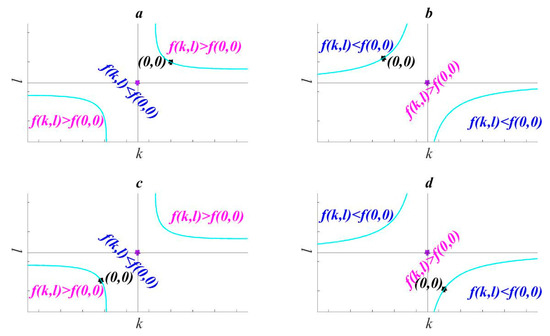 In Figure 2a and Figure 4a, as well as in other numerical experiments, the positional relationship between the coordinate origin and the saddle point can be classified as one of four types: (i) the coordinate origin is to the upper-right of the saddle point; (ii) the coordinate origin is to the upper-left of the saddle point; (iii) the coordinate origin is to the lower-left of the saddle point; and (iv) the coordinate origin is to the lower-right of the saddle point. According to this classification, the distribution of the variation in the correlation coefficient with trend coefficients k and l is as shown in Figure 5. Figure 5a illustrates the first case, where the black star denotes the coordinate origin and purple star denotes the saddle point, and the light cyan lines are the isolines equal to f(0, 0). These lines divide the coordinate plane into two parts. In the region between the two cyan curves, we have f(k, l) < f(0, 0), and so the value of the correlation coefficient becomes smaller. In the regions above and below the cyan curve, f(k, l) > f(0, 0), and the value of the correlation coefficient becomes larger. The quasi-symmetry of the function graph means that Figure 5a is similar to Figure 5c, and Figure 5b is similar to Figure 5d.