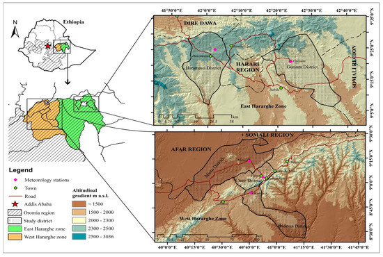In the East and West Hararghe zones, Ethiopia has been affected by the impact of climate change-induced drought, erratic and rainfall reduction, and increasing temperature [13,14]. Reference [15] indicated that eastern and southeastern parts of Ethiopia were severely affected by recurrent droughts, erratic rainfall, and increasing temperature conditions between 1981–2009. February to May (Belg) rainy season was lower than the mean by rainfall amount in the region was up to 60%. As a result, cereal yield was estimated to be below average, with crop failures reported in some areas [16].