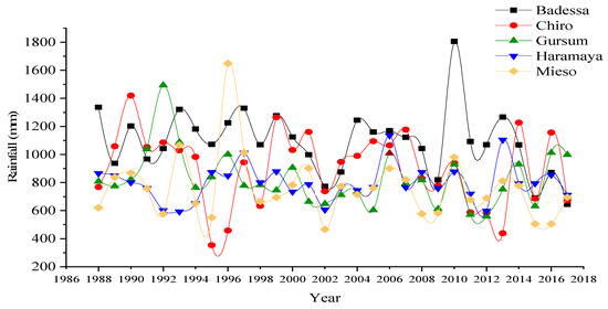 Daily rainfall and temperature data from 1988–2017 for 16 stations were obtained from the National Meteorological Agency (NMA) of Ethiopia. Among the 16 stations, only five of them—namely: Haramaya, Gursum, Chiro, Badessa, and Mieso—were selected based on a relatively long period of the data records, less than 10% missing value, and having the required climate parameters data as suggested by [24] (Table 1). The World Meteorological Organization has recommended 30 years as the minimum data required for searching evidence of climatic change in hydro-climatic time series [25].