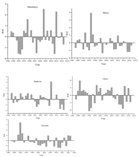 The result of the Mann–Kendall test revealed that trend of annual and seasonal mean rainfall in the region was not statistically significant. With regards to monthly mean rainfall, February and March showed a significant (p < 0.05) decreasing change. In East and West Hararghe zones, Ethiopia, in February the Belg season begins followed by March therefore significant decreasing trend in mean rainfall of those months may have affected livestock and Belg season crop production. Consistent with the result of this study, Reference [55] reported an insignificant trend in both annual and seasonal rainfall totals from 1979–2013 in the northern and south-western regions of Ethiopia. Consistent with this, Reference [14] reported that over 20% of the East and West Hararghe Zones are Belg rain-dependent.