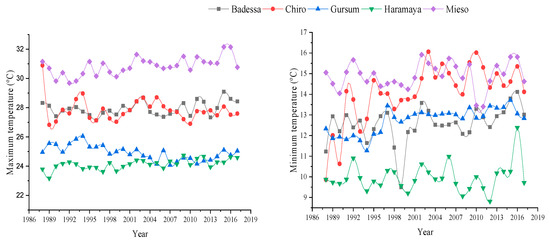 Long-term mean annual maximum and minimum temperature variability across districts from 1988–2017 in East and West Hararghe zones, Ethiopia.
