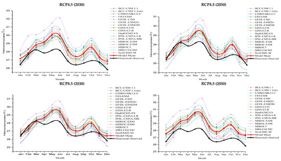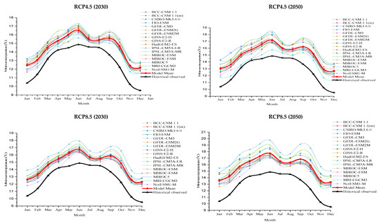 All the 17 models showed a similar change in projected annual, seasonal, and monthly mean maximum and minimum temperature. The t-test results also showed a significant change compared to baseline mean maximum and minimum temperature with respect to the time period and emission scenarios in the study districts (Table 7, Figure 5 and Figure 6).