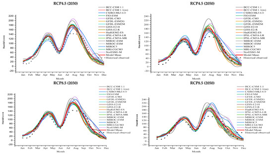The annual, seasonal, and monthly rainfall total from 17 GCMs are projected to change by −2.4% and 29.1% for 2030, and by 3.5% and 32% for 2050 under RCP4.5 and RCP8.5, respectively (Table 7 and Figure 7). A non-significant (p > 0.05) change of total annual rainfall is projected in Badessa and Gursum under both RCP and periods. In contrast, for both RCPs and projection periods, total annual rainfall is projected to change significantly compared to the baseline period for the rest of the studied district.