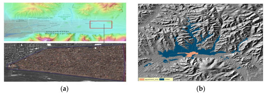 Serious environmental issues are common in densely populated large cities in developing countries. There are many factors contributing to this, starting with climate change; however, urbanization is a global problem [1]. In the past two decades, the number of inhabitants in Ulaanbaatar city has increased more than three times. The capital city of Mongolia sits on the Tuul River, the third-longest river in Mongolia, in a valley surrounded by large mountains, the geographical map of which is shown in Figure 1a. As the city was built in large river watershed lowland between mountains, the temperature is often inverse during the wintertime [2]. Moreover, the city’s geographical and climate features, as well as its poor heating system infrastructure, make the city one of the most air-polluted cities in the world today. The standard sewerage and pure water supply systems were initially designed for 400,000 inhabitants 46 years ago, but now around one 1.4 million people live in Ulaanbaatar, [3]. Some of these 1.4 million citizens are living in the boundary areas of the city, called ger districts in some reports, which are suburbs that are not connected to the main heating supply. In these suburbs, every family has its stoves and brick stoves as their heat source. Figure 1 shows two neighboring districts: one comprises standard heating-supplied buildings, and the other is a suburb with traditional heating stoves. Unfortunately, the suburban area increases every year [4]. Figure 1 also illustrates the suburban area and the area of standard heated buildings, with the ger district area being 6–7 times larger than the area with apartments. In the warm season, wood is the most commonly used material in traditional stoves, but in the cold season, coal is used. Furthermore, in the outer boundary areas of the ger districts, other materials are sometimes used to reach the minimum warm temperature for living, such as tires, bones, old clothes, etc.