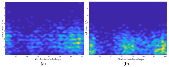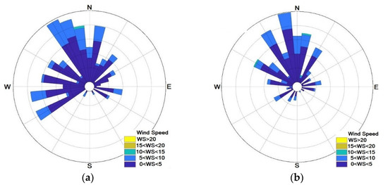 The distribution of wind with respect to direction and speed in 2016–2019. (a) The station at the university. (b) The station at the airport.