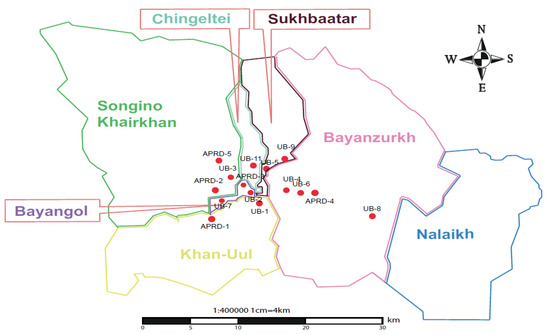 Due to Ulaanbaatar’s air pollution issues, there is a need to expand the network by equipping it with automatic, continuous measurement capabilities and improving its capacity. The air-quality monitoring network consists of the Air Pollution Reducing Department of Capital City (APRD) Network and the NAMEM Network. A German grant established the APRD Network with five stations in 2008, and the NAMEM Network, with 10 stations, was established by means of a French loan in 2010. Currently, 12 automatic stations are measuring sulfur dioxide, nitrogen oxides, carbon monoxide, ozone, , and every 15–30 min, and 3 non-automatic controls of sulfur dioxide and nitrogen dioxide (Figure 3). The concentration is determined using a chemical solution.