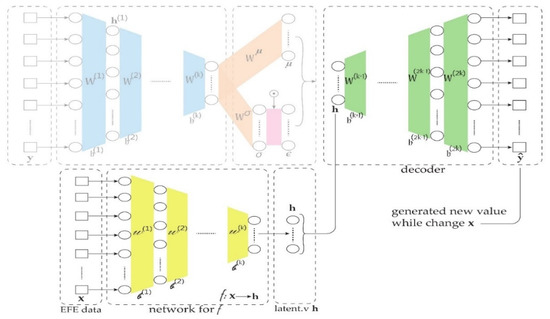The process of optimizing those parameters is based on backpropagation and a gradient descent algorithm. Initially, it starts with random choice in and , then the sensitiveness of training errors in little changes in those parameters, and the derivative of the training error leads to the chain rule and backpropagation. The network architecture is represented in Figure 5, and the architecture of the VAE, and the algorithm of optimizing the parameters, are described in the next section, along with the embedded network.