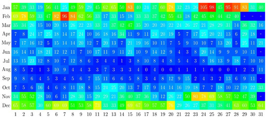 Finally, to validate our suggested method, the EFE data of the first three months of 2020 were selected for generating the predicted air pollution concentration. With respect to the first 90 days and the pollution measurement stations, the model provides 90 60 = 5400 as the number of results. This large number of results requires an expression of the outcome in an optimal way, and we elected a few specific depictions. For this reason, the most frequently polluted days of each pollution index were chosen to illustrate the results. Table 2 represents the most frequently polluted dates in the first three months of our four years of data.