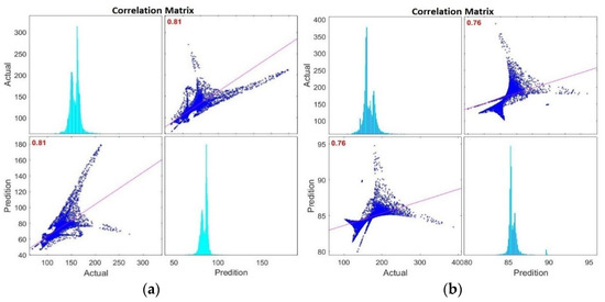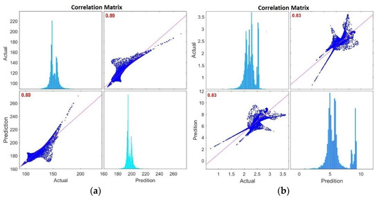 The correlation matrix of actual and predicted values. (a) , (b) .
