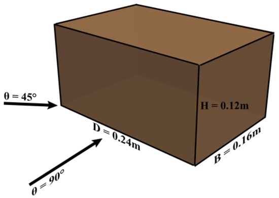 To analyze the effects of the generated turbulent inflow on aerodynamic characteristics of low-rise buildings, in the present study, we focus on an isolated low-rise building with a flat roof without eaves, and the building geometry is characterized by a height () equal to 0.12 m, a breadth (B) equal to 0.16 m, and a depth (D) equal to 0.24 m, which is the same with the dimensions in the wind tunnel test. The low-rise building is impacted by the generated turbulence fields for two wind directions: θ = 90° and θ = 45°, which is illustrated in Figure 1. The case of θ = 90° represents the condition that the largest building surface area is directly impacted by the inflow, while the θ = 45° represents the condition that the incoming flow is evenly separated by the building at the edges of the windward side, which leads to a complex flow field around the building. Since the similar angle combination of 45° and 90° is also adopted by other references [], we believe such two cases can be adopted as the typical condition for evaluating the generated turbulence wind field. The fluctuating surface pressure coefficient on buildings will be compared with the corresponding wind tunnel results to evaluate the rationality of the generated wind field. In the wind tunnel test, the wind pressure measurement taps are disposed uniformly over the surfaces of the tested models with spaces of about 0.02 m to measure the wind-induced building surface pressure. There are 240 taps for the isolated model, and all taps can measure the fluctuating wind pressures nearly synchronously at a sampling frequency of 500 Hz for a duration of 18 s. For the corresponding simulation cases, hundreds of uniformly distributed probe points, which follow the same distribution as the wind tunnel test, are prescribed on the building surface to acquire pressure data at each timestep for the duration of 10 s. The distribution of pressure measurement points on the building surfaces is illustrated by the black dots in Figures 12 and 13.