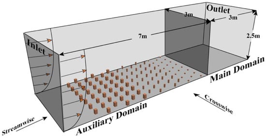All the numerical simulations are conducted in the rectangle domains; the crosswise width of the domain is 3 m, and the height is 2.5 m. The streamwise length of the domain is 10 m and divided into two parts: the auxiliary domain for the first 7 m and the main domain for the last 3 m; see Figure 2.