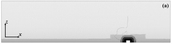 where is the average velocity over the fluid volume, is the average velocity over the whole grid, is the volume occupancy rate that is the ratio of obstacle volume to the whole grid volume , is the drag coefficient of any bluff body, and is the frontal area of the single bluff body. In case of the realization of roughness blocks, we first generate a mesh and select the grid cells occupied by roughness blocks; then, the drag force given by the equation will be applied in these selected cells to represent the effects of the solid blocks. Since the velocity in these cells should be constantly zero, we set the volume occupancy rate to a number smaller than but very close to 1.0. As a result, the is a number approaching infinity, and the grid-averaged velocity in selected cells will be nearly zero [].